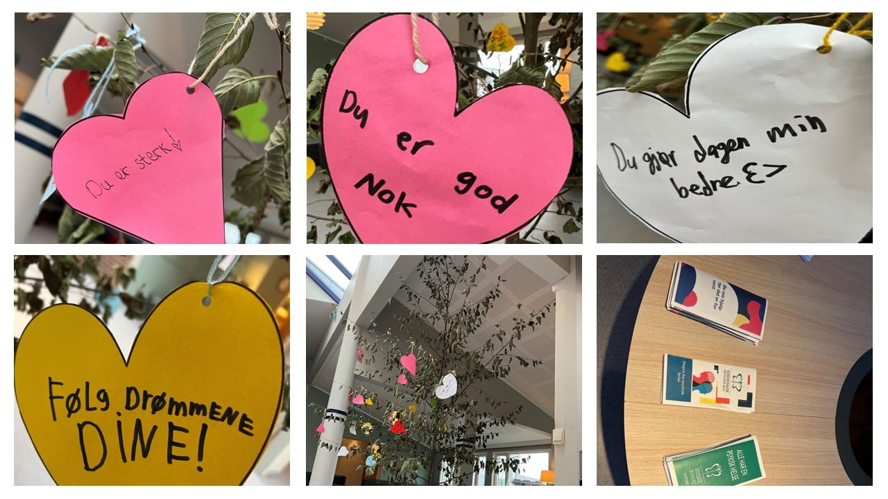 Vi på Feiring videregående skole har markert denne dagen. Det har kostet en del for noen av elevene våre. Noen har forberedt denne dagen en stund med å lage brosjyrer om psykisk helse og ulike lidelser. Noen har gruet seg, noen har hatt få tanker om at denne markeringen skal foregå og noen har forberedt seg mentalt på å takle denne dagen. I hele dag har jeg observert lærere sammen med elever, lyttet til gode samtaler og observert at alle har gjort en og samme ting når jeg har kommet inn i rommet, nemlig løftet blikket. «Hjertetre» er laget der elevene har skrevet fine ord til hverandre, hengt på treet og de har virkelig måtte jobbe for å ta til seg de gode ordene. Ta til seg at noen løfter blikket.
